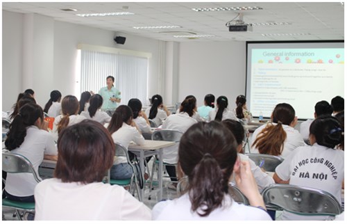 Ảnh Ms Lan - Phó trưởng phòng Kế toán, Nhà máy Canon-Thăng Long chia xẻ công tác kế toán của Canon Việt Nam và động viên sinh viên rèn luyện những kỹ năng mềm, kỹ năng chuyên môn cần có của người làm nghề kế toán